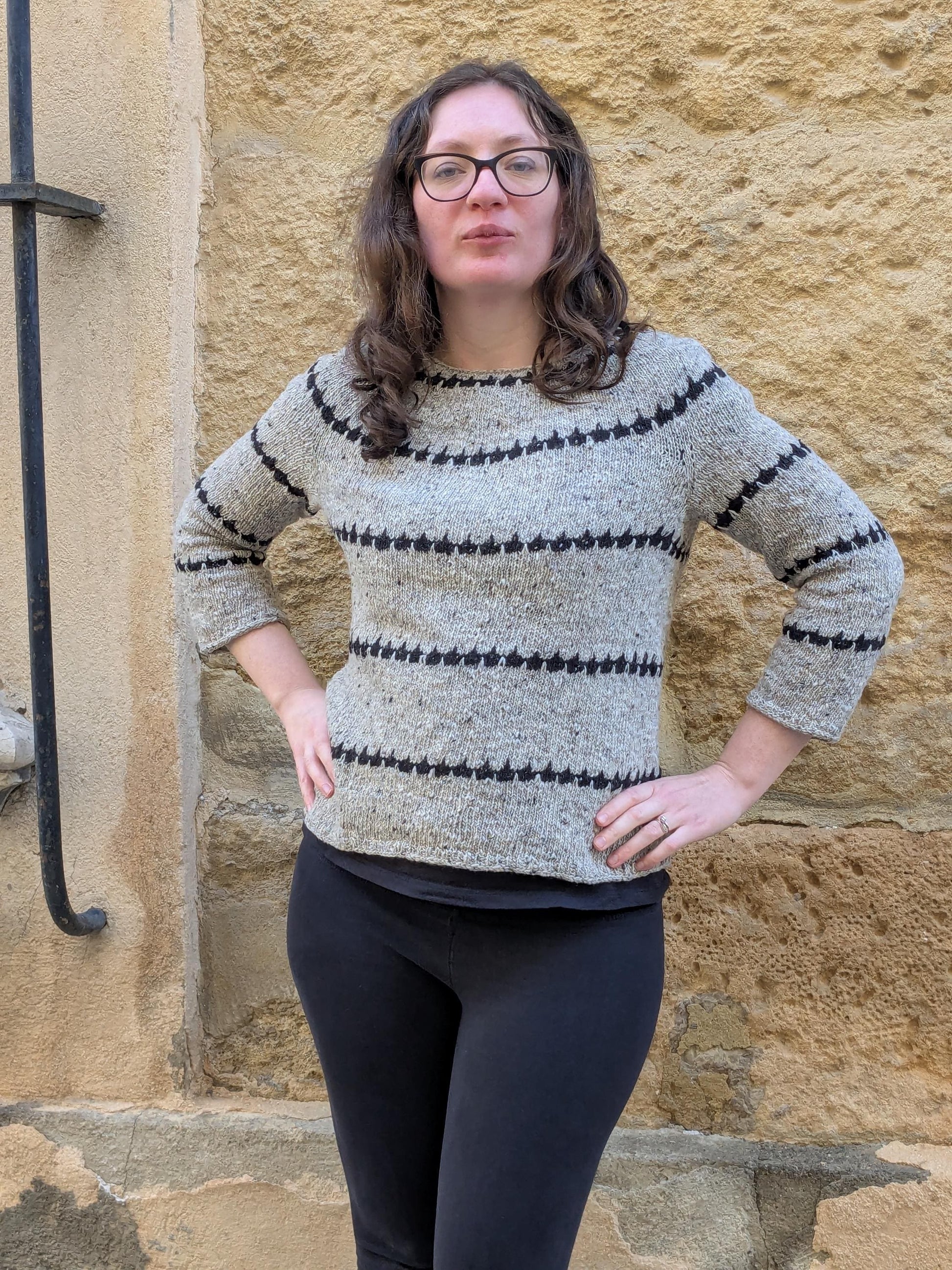 Eske est un beau gris moyen avec des noppes de blanc, beige, noir et marron c'est un coloris plutôt doux et passe-partout pour n'importe lequel de vos projets ! En photo vous pouvez voir le pull Heimathafen de Isabell Kraemer que j'ai tricoté en utilisant le fil Sheelin pour les rayures et le coloris Eske en couleur principale.