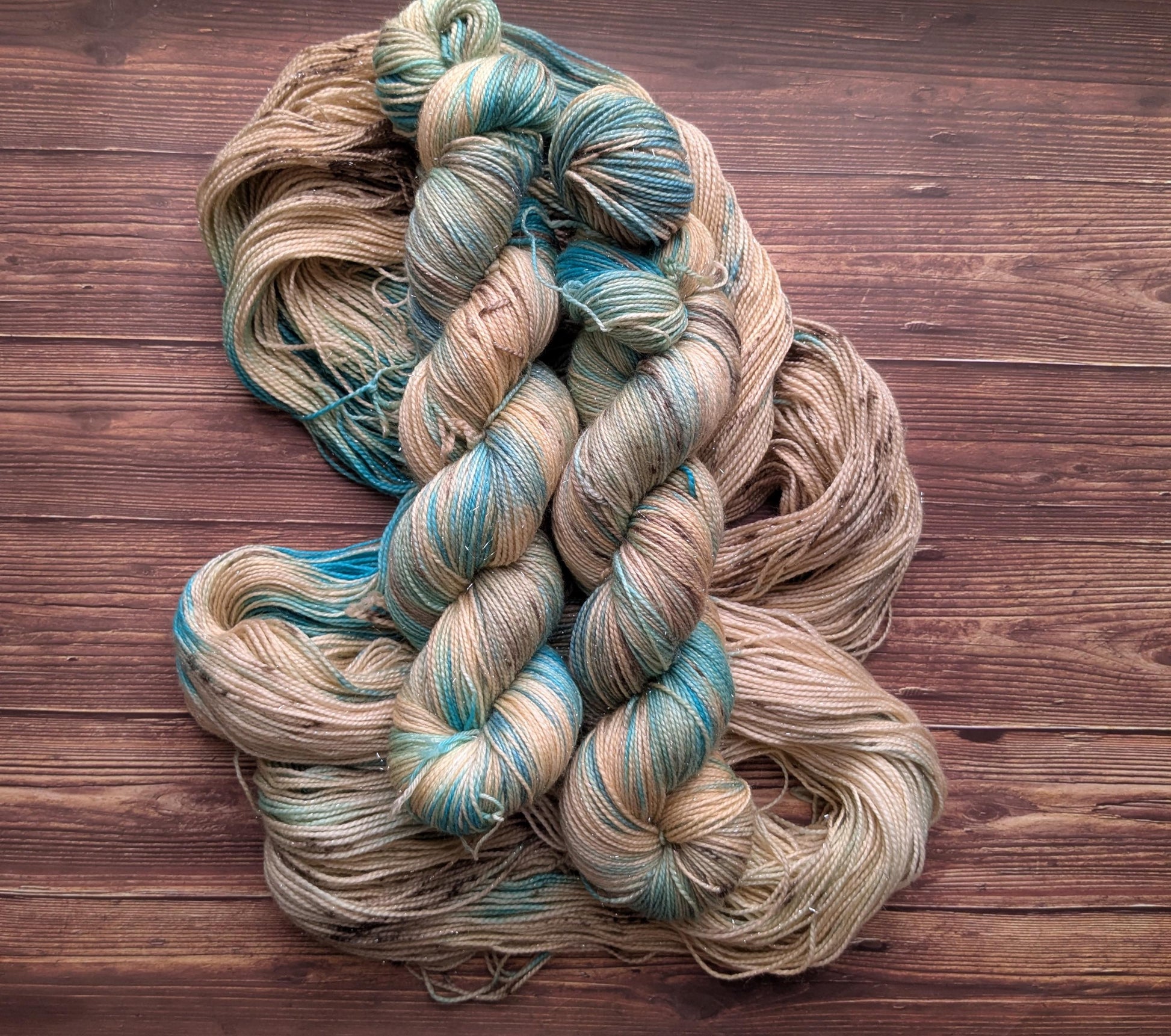 Voici un nouveau coloris parfait pour l'été : voici les pieds dans le sable, un coloris qui sent bon la mer et les tropiques ! Sur une base de beige sable viennent se déposer des nuances de bleu turquoise et des speckels de marron noix de coco ! Ce coloris s'accordera parfaitement avec le coloris Dans les profondeurs car ils ont été teints en duo !