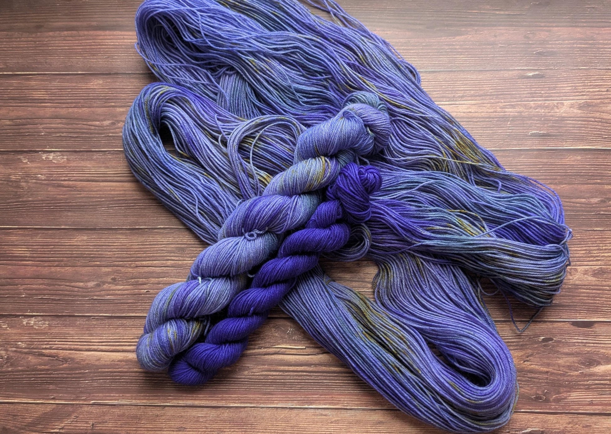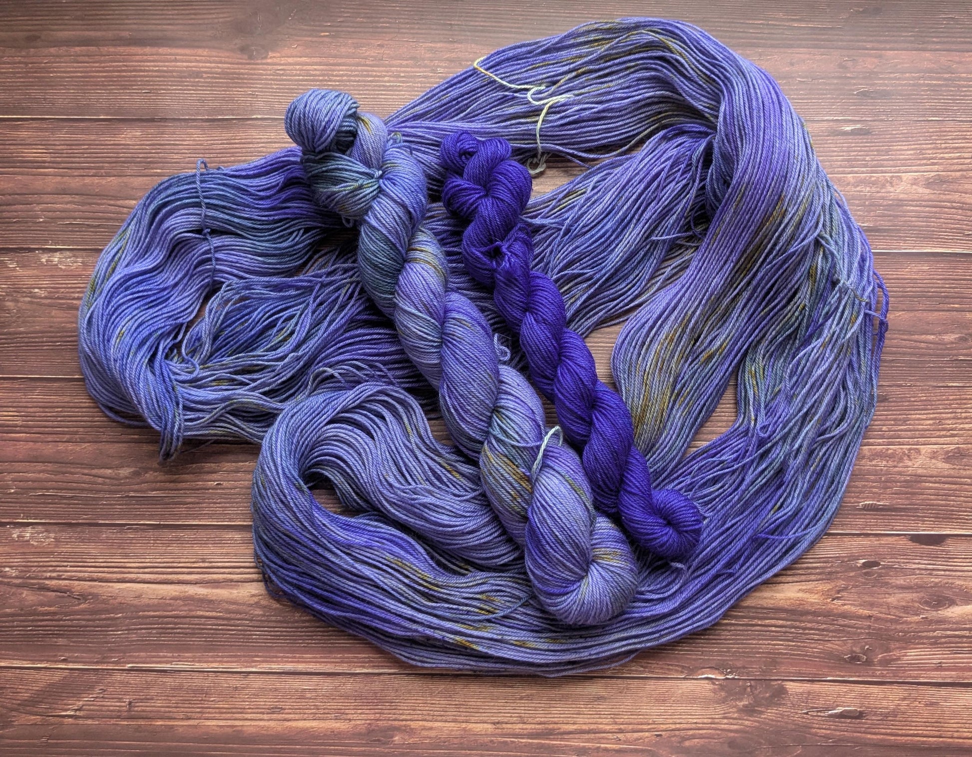 C'est un coloris plutôt foncé mais avec beaucoup de reflets et de nuances qui se dévoileront tout au long du tricot ! Violette s'entendra avec une multitude de coloris toutes les nuances de violet foncé, de bleu foncé, de gris ou de noir mais également du jaune du lilas ou du parme clair. Il a été conçu en duo avec le coloris Iris, ils ont des pigments en commun !